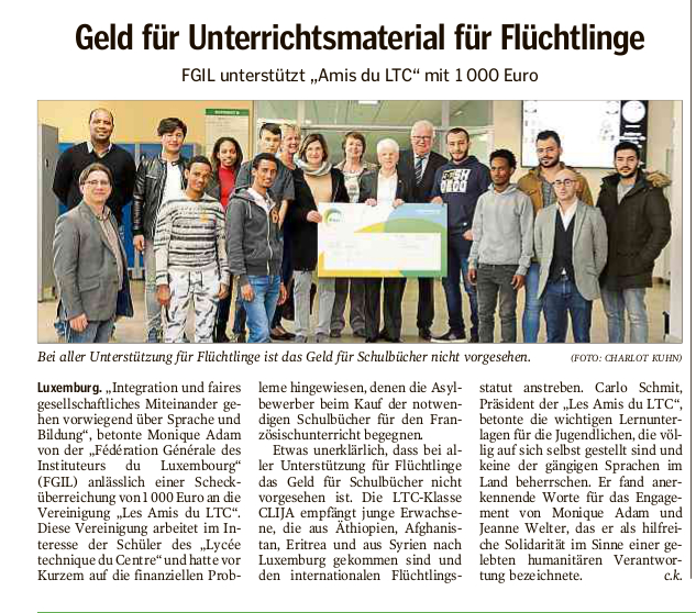 Luxemburger Wort : "Geld für Unterrichtsmaterial für Flüchtlinge"
